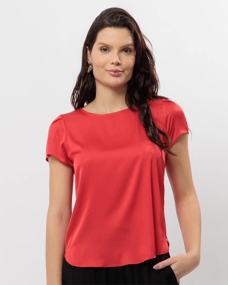 Blusa Manga Curta com Pregas Acetinada com Elastano. Costas com Botão. Peça Coringa No Seu Closet